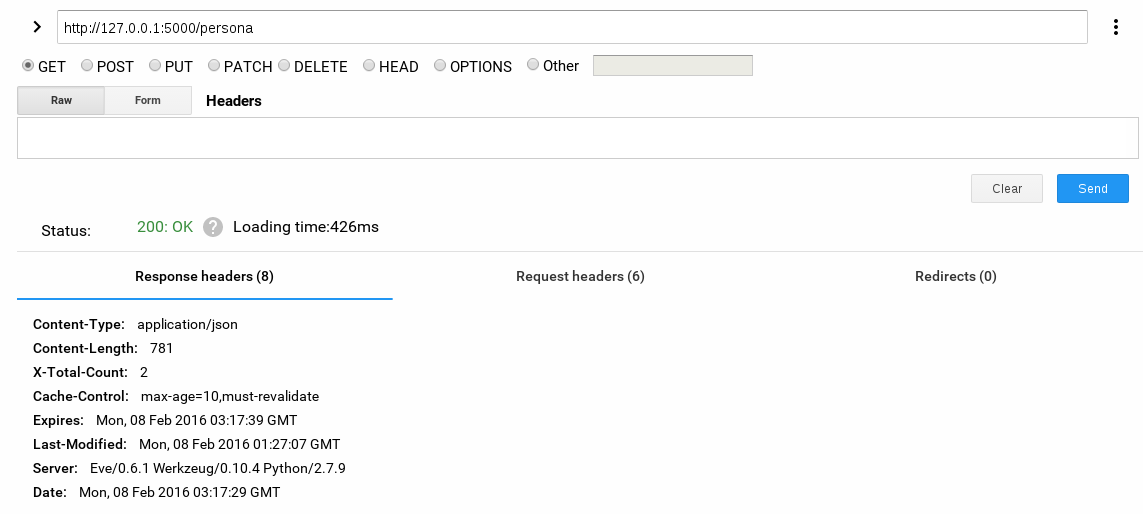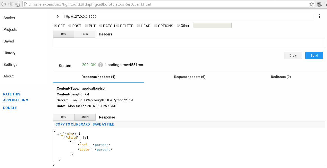 Se consulta vía GET a http://127.0.0.1:500 por medio de la extensión de google chrome restclient: