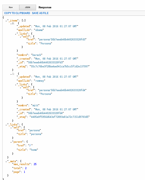 { "_status": "OK", "_items": [ { "_updated": "Mon, 08 Feb 2016 03:34:41 GMT", "_links": { "self": { "href": "persona/56b80cd146b4402633320fd5", "title": "Persona" } }, "_created": "Mon, 08 Feb 2016 03:34:41 GMT", "_status": "OK", "_id": "56b80cd146b4402633320fd5", "_etag": "cb32857db339920319adeb23b29359936c92680f" }, { "_updated": "Mon, 08 Feb 2016 03:34:41 GMT", "_links": { "self": { "href": "persona/56b80cd146b4402633320fd6", "title": "Persona" } }, "_created": "Mon, 08 Feb 2016 03:34:41 GMT", "_status": "OK", "_id": "56b80cd146b4402633320fd6", "_etag": "c14c62e94c88dd227ccffaf5c248f18492040ee2" } ] }