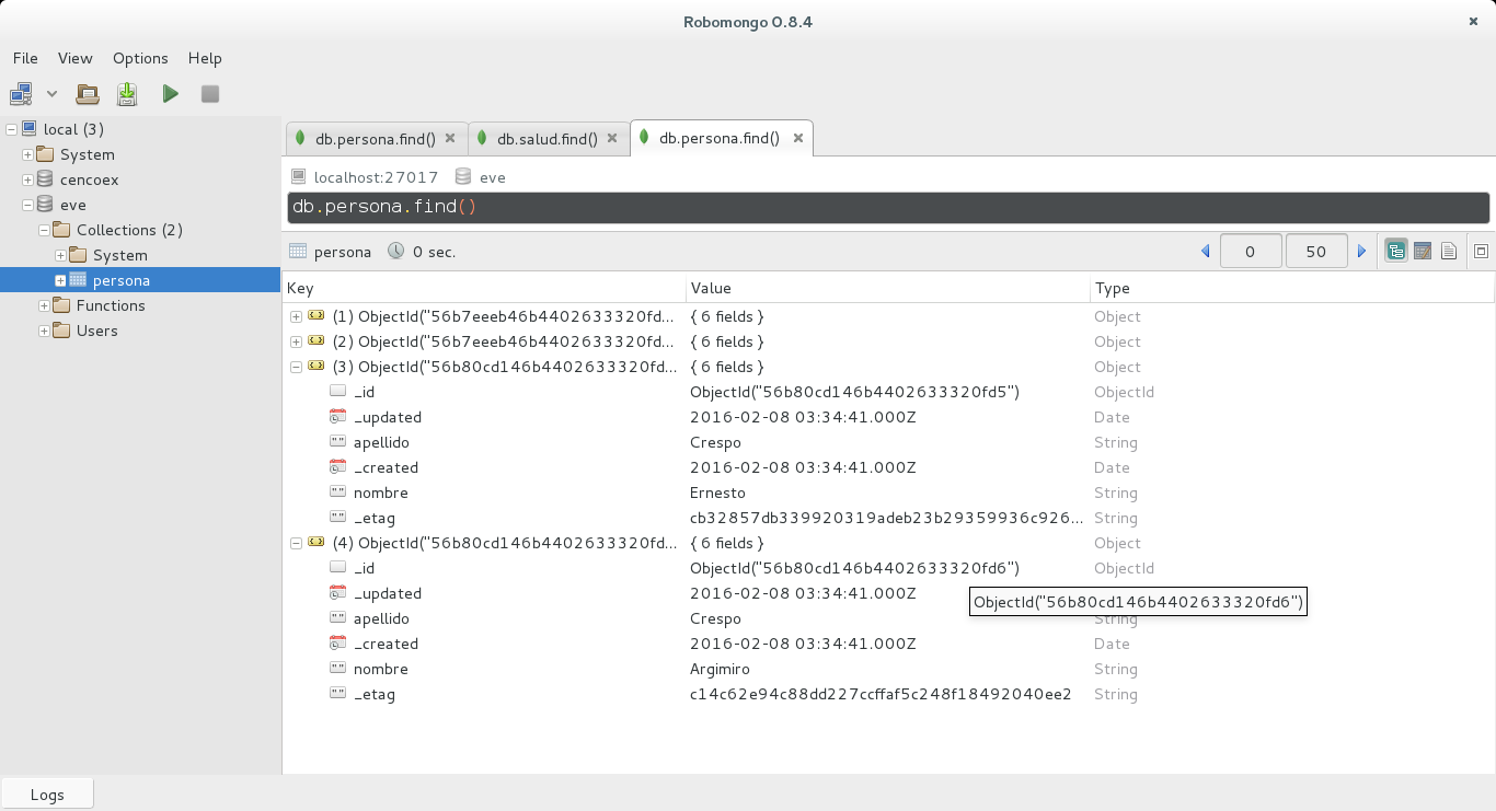 Con robomongo se puede observar que ya se tiene dos documentos agregados a la colección persona de la base de datos eve:
