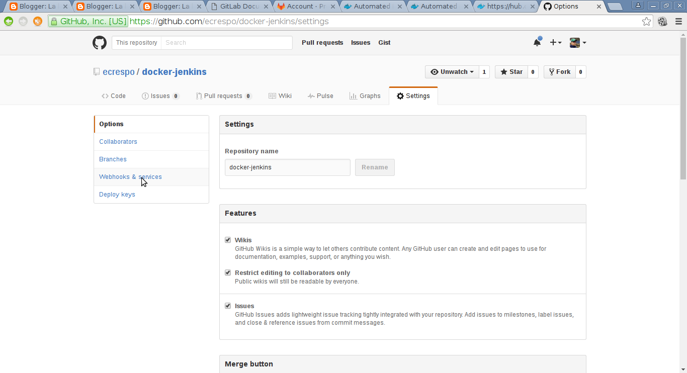 Ahora en github se va al setting del repositorio que se quiere asociar, a la parte de webhooks y service como lo muestra la figura: