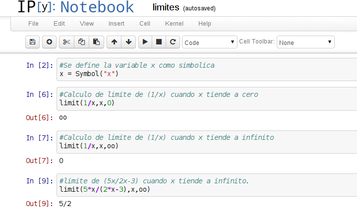 En este caso se mostrará como realizar cálculo de límites con sympy.
