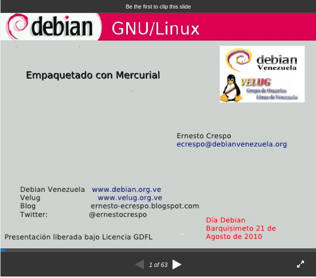 Ya publique en slideshare la charla que dicte en el día Debian en Barquisimeto. Lo pueden bajar por acá: http://www.slideshare.net/ecrespo/empaquetar-un-paquete-debian-por-medio-de-mercurial