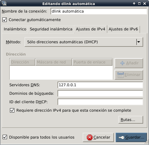 Se selecciona la pestaña de Ajuste de IPv4, en el método se selecciona Sólo direcciones automáticas (DHCP) y se coloca la IP 127.0.0.1 en Servidor de DNS:
