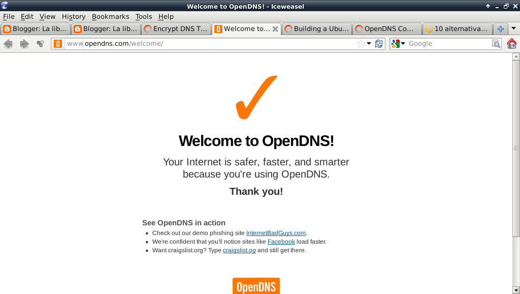 Para verificar que se esté usando los servidores de DNS de OpenDNS se abre el navegador a la URL http://www.opendns.com/welcome :
