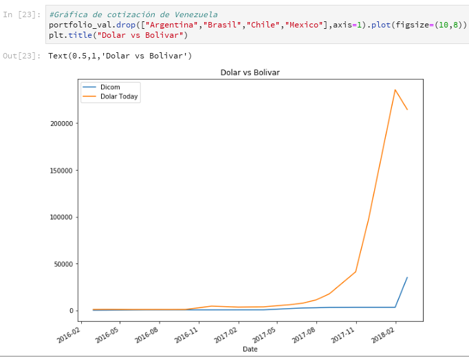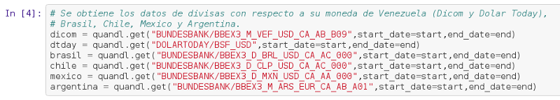 La idea de este artículo es explicar de manera básica el uso de Pandas para obtener datos financieros, en este caso el valor de las divisas de Países como Argentina, Brasil, Chile, Mexico y Venezuela. Quandl es una plataforma financiera y económica de datos alternativos que sirve para inversores profesionales. El API de Quandl permite el acceso a sus datos por medio de Lenguaje R, Python, Matlab, Maple y Stata. Más información en wikipedia (enlace roto) y en su página.