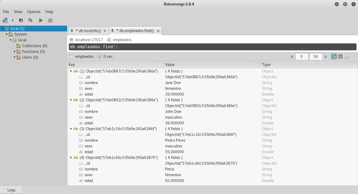 [{"_id": {"$oid": "57eb0887c535b9e290a6386d"}, "nombre": "Jane Doe", "sexo": "femenino", "edad": 29.0}, {"_id": {"$oid": "57eb0892c535b9e290a6386e"}, "nombre": "John Doe", "sexo": "masculino", "edad": 39.0}, {"_id": {"$oid": "57eb1c16c535b9e290a6386f"}, "nombre": "Pedro Perez", "sexo": "masculino", "edad": 55.0}, {"_id": {"$oid": "57eb1c66c535b9e290a63870"}, "nombre": "Petra", "sexo": "femenino", "edad": 65.0}]