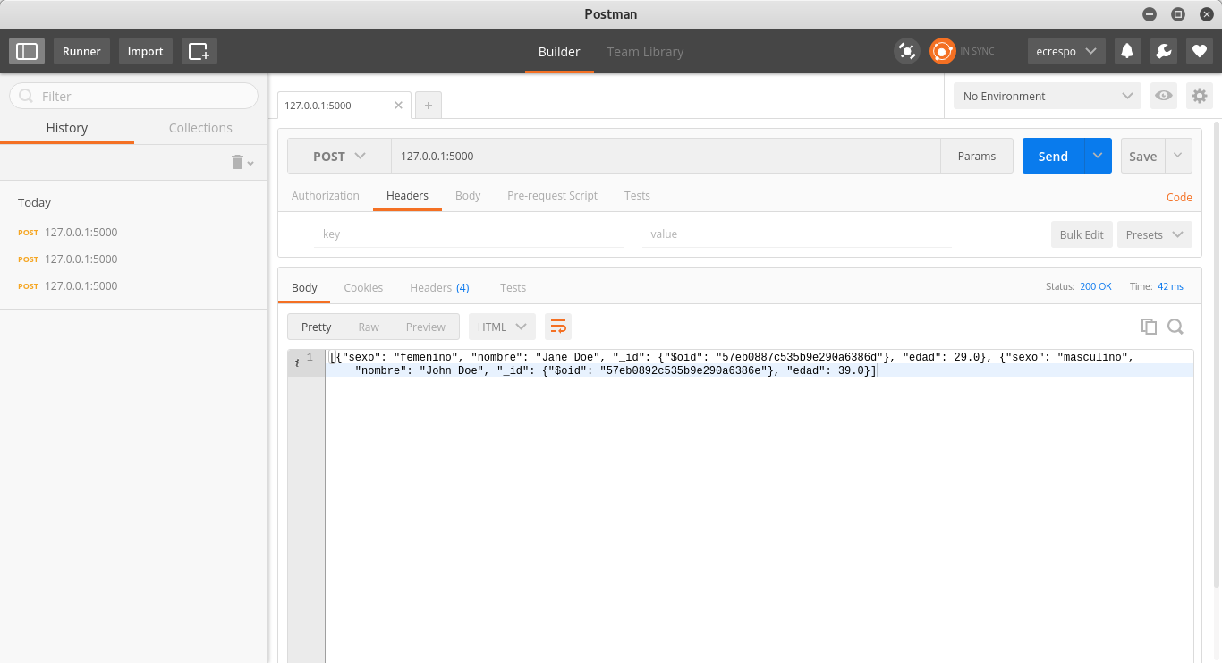 Al consultar vía POST a 127.0.0.1 puerto 5000, se devuelve el json con todos los empleados que se tienen en la base de datos mongodb.