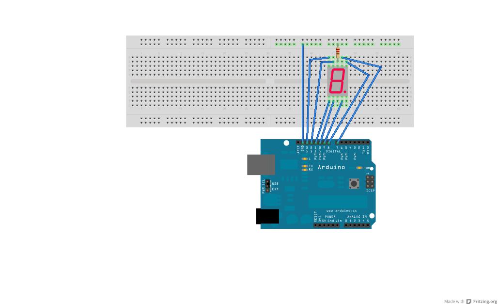 int pausa=1000; // define la pausa entre cada digito #Se definen los Pines de salida al display 7 segmentos void setup() { pinMode(7, OUTPUT); pinMode(8, OUTPUT); pinMode(9, OUTPUT); pinMode(10, OUTPUT); pinMode(11, OUTPUT); pinMode(12, OUTPUT); pinMode(13, OUTPUT); } //Se define la funcion display que recibe 7 //variables y se asignan a cada una de sus salidas void display (int a, int b, int c, int d, int e, int f, int g) // Funcion del display { digitalWrite (7,a); digitalWrite (8,b); digitalWrite (9,c); digitalWrite (10,d); digitalWrite (11,e); digitalWrite (12,f); digitalWrite (13,g); } //Funcion principal que genera un lazo continuo void loop() // Dependiendo de cada dígito, se envía a la función display // los estados (0 y 1) a cada uno de los segmentos { display (1,1,1,1,1,1,0); //escribe 0 delay(pausa); display (0,1,1,0,0,0,0); //escribe 1 delay(pausa); display (1,1,0,1,1,0,1); //escribe 2 delay(pausa); display (1,1,1,1,0,0,1); //escribe 3 delay(pausa); display (0,1,1,0,0,1,1); //escribe 4 delay(pausa); display (1,0,1,1,0,1,1); //escribe 5 delay(pausa); display (1,0,1,1,1,1,1); //escribe 6 delay(pausa); display (1,1,1,0,0,0,0); //escribe 7 delay(pausa); display (1,1,1,1,1,1,1); //escribe 8 delay(pausa); display (1,1,1,0,0,1,1); //escribe 9 delay(pausa); }