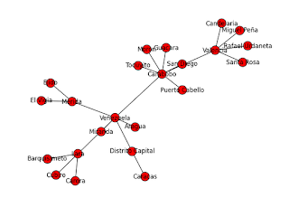 Nodos: 23 ['Caracas', 'Ejido', u'Miguel Pe\xf1a', 'Tocuyito', 'Aragua', 'Santa Rosa', 'Valencia', 'Moron', 'Carora', 'Venezuela', 'San Diego', 'Cubiro', 'Miranda', 'Puerto Cabello', 'El Vigia', 'Distrito Capital', 'Barquisimeto', 'Merida', 'Rafael Urdaneta', 'Lara', 'Guacara', 'Carabobo', 'Candelaria'] Enlaces: 23 [('Caracas', 'Distrito Capital'), ('Ejido', 'Merida'), (u'Miguel Pe\xf1a', 'Valencia'), ('Tocuyito', 'Carabobo'), ('Aragua', 'Venezuela'), ('Santa Rosa', 'Valencia'), ('Valencia', 'Candelaria'), ('Valencia', 'Carabobo'), ('Valencia', 'Rafael Urdaneta'), ('Moron', 'Carabobo'), ('Carora', 'Lara'), ('Venezuela', 'Distrito Capital'), ('Venezuela', 'Lara'), ('Venezuela', 'Merida'), ('Venezuela', 'Miranda'), ('Venezuela', 'Carabobo'), ('San Diego', 'Carabobo'), ('Cubiro', 'Lara'), ('Puerto Cabello', 'Carabobo'), ('El Vigia', 'Merida'), ('Barquisimeto', 'Lara'), ('Merida', 'Merida'), ('Guacara', 'Carabobo')]