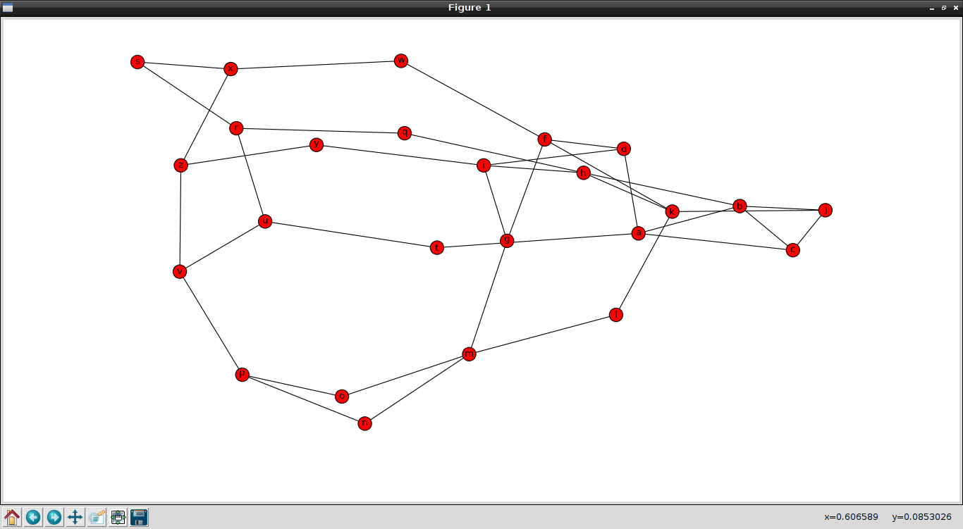 Nodos: ['a', 'c', 'b', 'd', 'g', 'f', 'i', 'h', 'k', 'j', 'm', 'l', 'o', 'n', 'q', 'p', 's', 'r', 'u', 't', 'w', 'v', 'y', 'x', 'z'] Relaciones: [('a', 'c'), ('a', 'b'), ('a', 'd'), ('a', 't'), ('c', 'b'), ('c', 'j'), ('b', 'h'), ('b', 'j'), ('d', 'i'), ('d', 'f'), ('g', 'i'), ('g', 'm'), ('g', 'f'), ('f', 'w'), ('f', 'k'), ('i', 'y'), ('i', 'h'), ('h', 'q'), ('h', 'k'), ('k', 'j'), ('k', 'l'), ('m', 'o'), ('m', 'l'), ('m', 'n'), ('o', 'p'), ('n', 'p'), ('q', 'r'), ('p', 'v'), ('s', 'x'), ('s', 'r'), ('r', 'u'), ('u', 't'), ('u', 'v'), ('w', 'x'), ('v', 'z'), ('y', 'z'), ('x', 'z')] Vecinos de m: ['o', 'l', 'g', 'n'] Valor del nodo a: {'c': {}, 'b': {'weight': 1}, 'd': {}, 't': {}} Peso de la relacion entre a y b: {'weight': 1} Ruta mas corta entre m y b: ['m', 'l', 'k', 'h', 'b'] Promedio de la ruta mas corta 2.99 Muestra la relacion de ruta mas corta entre pares de nodos relacionado con m: {'a': ['m', 'g', 'i', 'd', 'a'], 'c': ['m', 'l', 'k', 'j', 'c'], 'b': ['m', 'g', 'i', 'h', 'b'], 'd': ['m', 'g', 'i', 'd'], 'g': ['m', 'g'], 'f': ['m', 'g', 'f'], 'i': ['m', 'g', 'i'], 'h': ['m', 'g', 'i', 'h'], 'k': ['m', 'l', 'k'], 'j': ['m', 'l', 'k', 'j'], 'm': ['m'], 'l': ['m', 'l'], 'o': ['m', 'o'], 'n': ['m', 'n'], 'q': ['m', 'g', 'i', 'h', 'q'], 'p': ['m', 'o', 'p'], 's': ['m', 'g', 'f', 'w', 'x', 's'], 'r': ['m', 'g', 'i', 'h', 'q', 'r'], 'u': ['m', 'o', 'p', 'v', 'u'], 't': ['m', 'g', 'i', 'd', 'a', 't'], 'w': ['m', 'g', 'f', 'w'], 'v': ['m', 'o', 'p', 'v'], 'y': ['m', 'g', 'i', 'y'], 'x': ['m', 'g', 'f', 'w', 'x'], 'z': ['m', 'o', 'p', 'v', 'z']} Ruta mas corta usando el algoritmo de Dijkstra entre m y b: ['m', 'g', 'i', 'h', 'b']