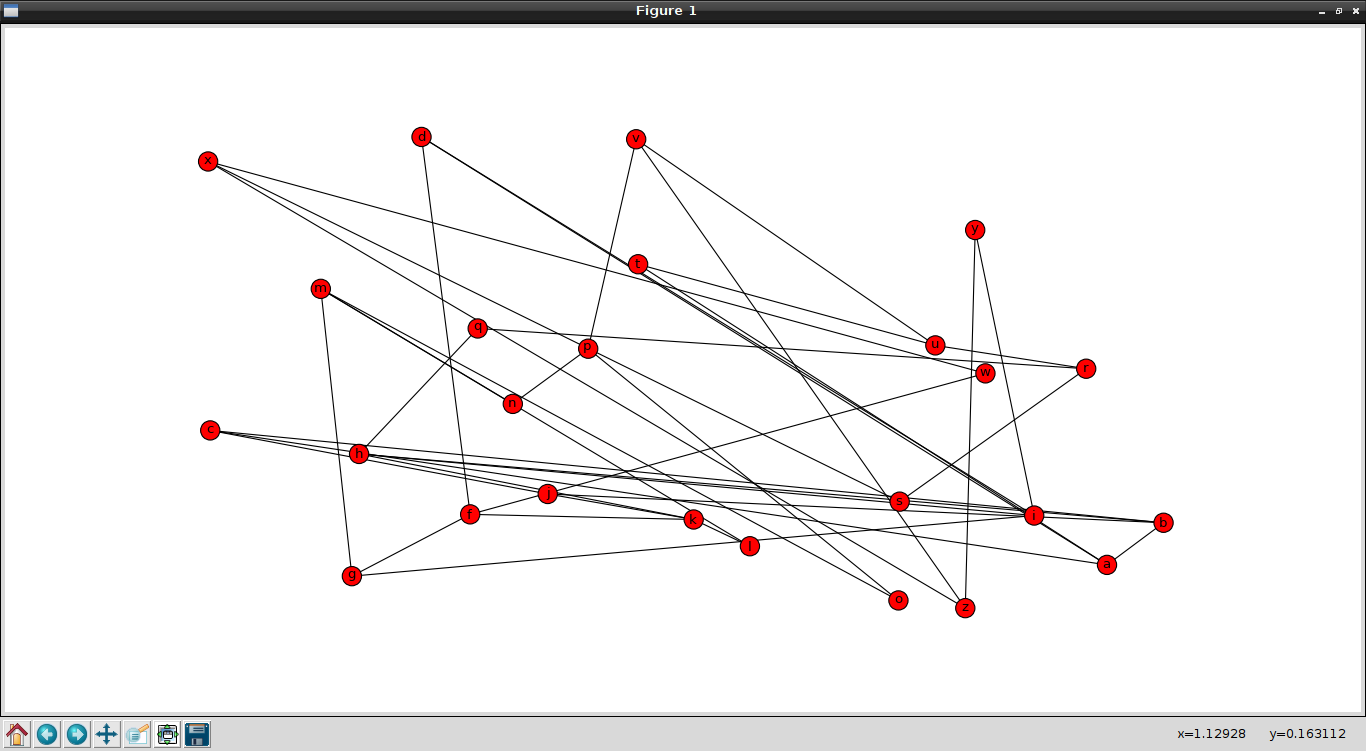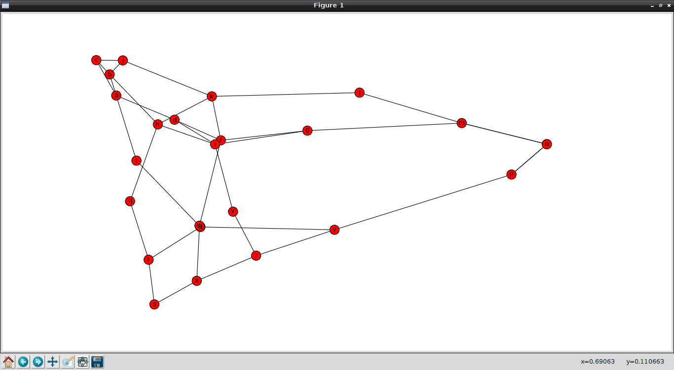 #!/usr/bin/env python import networkx as net #Se importa la libreria pyplot de matplotlib como plt import matplotlib.pyplot as plt #Se crea la instancia vacia del grafo g=net.Graph() #Se crean los nodos con sus relaciones g.add_edge('a','b') g.add_edge('b','c') g.add_edge('c','a') g.add_edge('a','d') g.add_edge('f','d') g.add_edge('g','f') g.add_edge('h','b') g.add_edge('i','h') g.add_edge('i','g') g.add_edge('j','c') g.add_edge('k','j') g.add_edge('l','k') g.add_edge('m','l') g.add_edge('k','h') g.add_edge('i','d') g.add_edge('f','k') g.add_edge('m','g') g.add_edge('n','m') g.add_edge('o','m') g.add_edge('p','o') g.add_edge('q','h') g.add_edge('r','q') g.add_edge('s','r') g.add_edge('t','a') g.add_edge('u','t') g.add_edge('v','u') g.add_edge('j','b') g.add_edge('w','f') g.add_edge('x','w') g.add_edge('y','i') g.add_edge('z','y') g.add_edge('n','p') g.add_edge('z','x') g.add_edge('z','v') g.add_edge('s','x') g.add_edge('p','v') g.add_edge('r','u') print "Nodos: ",g.nodes() print "Relaciones: ",g.edges() #Se define un tamagno al nodo a y un peso a la relacion entre el nodo a y b g.node['a']['size']=1 g['a']['b']['weight']=1 print "Vecinos de m: ", g.neighbors('m') print "Valor del nodo a: ",g['a'] print "Peso de la relacion entre a y b: ", g['a']['b'] print "Ruta mas corta entre m y b: ",net.algorithms.shortest_path(g,'m','b') print "Promedio de la ruta mas corta ",net.algorithms.average_shortest_path_length(g) print "Muestra la relacion de ruta mas corta entre pares de nodos relacionado con m: ", net.algorithms.all_pairs_shortest_path(g)['m'] print "Ruta mas corta usando el algoritmo de Dijkstra entre m y b:",net.algorithms.dijkstra_path(g, 'm', 'b') #Se dibuja el grafo net.draw(g) #net.draw_spectral(g) #net.draw_circular(g) #net.draw_random(g) #Se muestra el grafico plt.show()