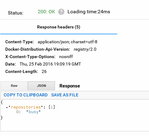 $ curl -i http://localhost:5000/v2/ HTTP/1.1 200 OK Content-Length: 2 Content-Type: application/json; charset=utf-8 Docker-Distribution-Api-Version: registry/2.0 X-Content-Type-Options: nosniff Date: Thu, 25 Feb 2016 18:40:25 GMT