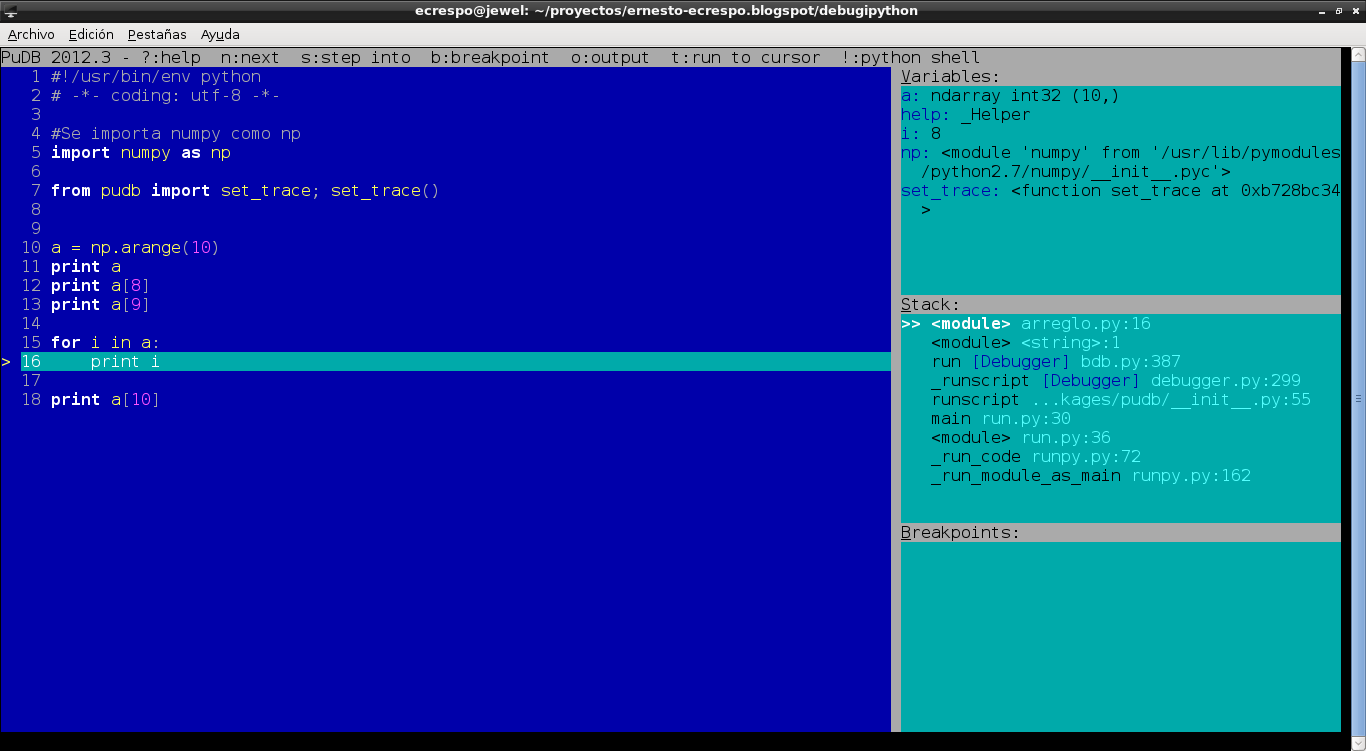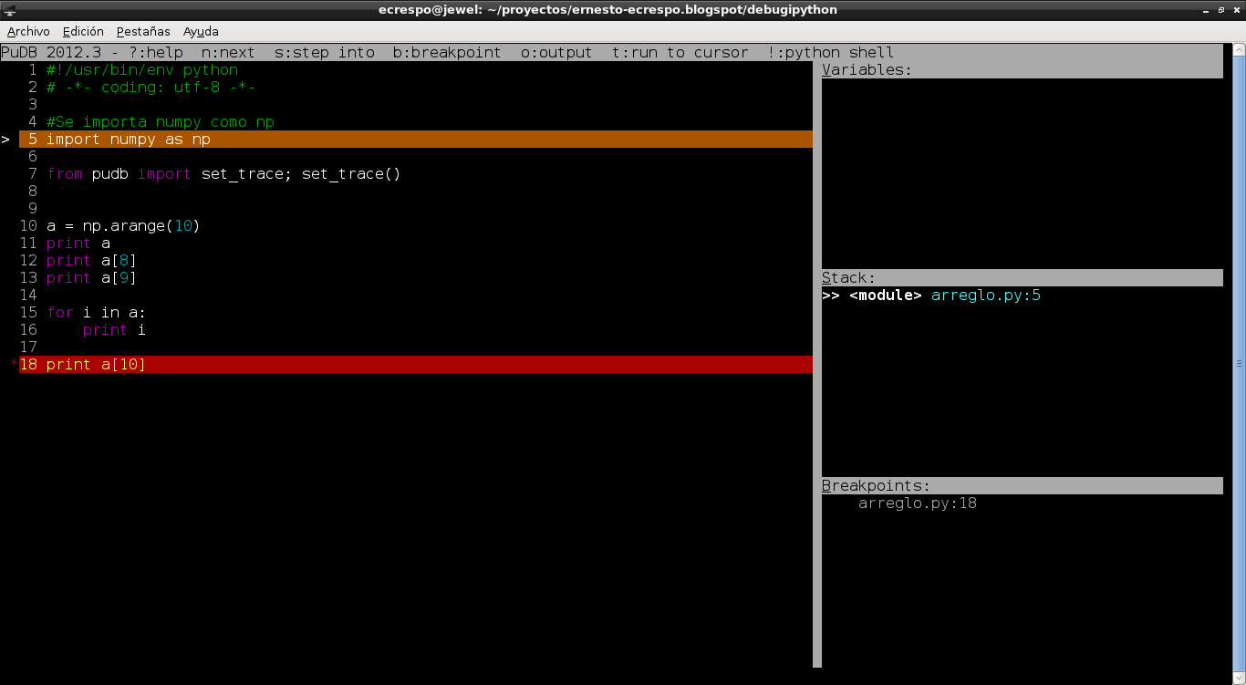 Se depurará el mismo código del artículo anterior (enlace roto). Se agregará al código para la depuración: from pudb import set_trace; set_trace()