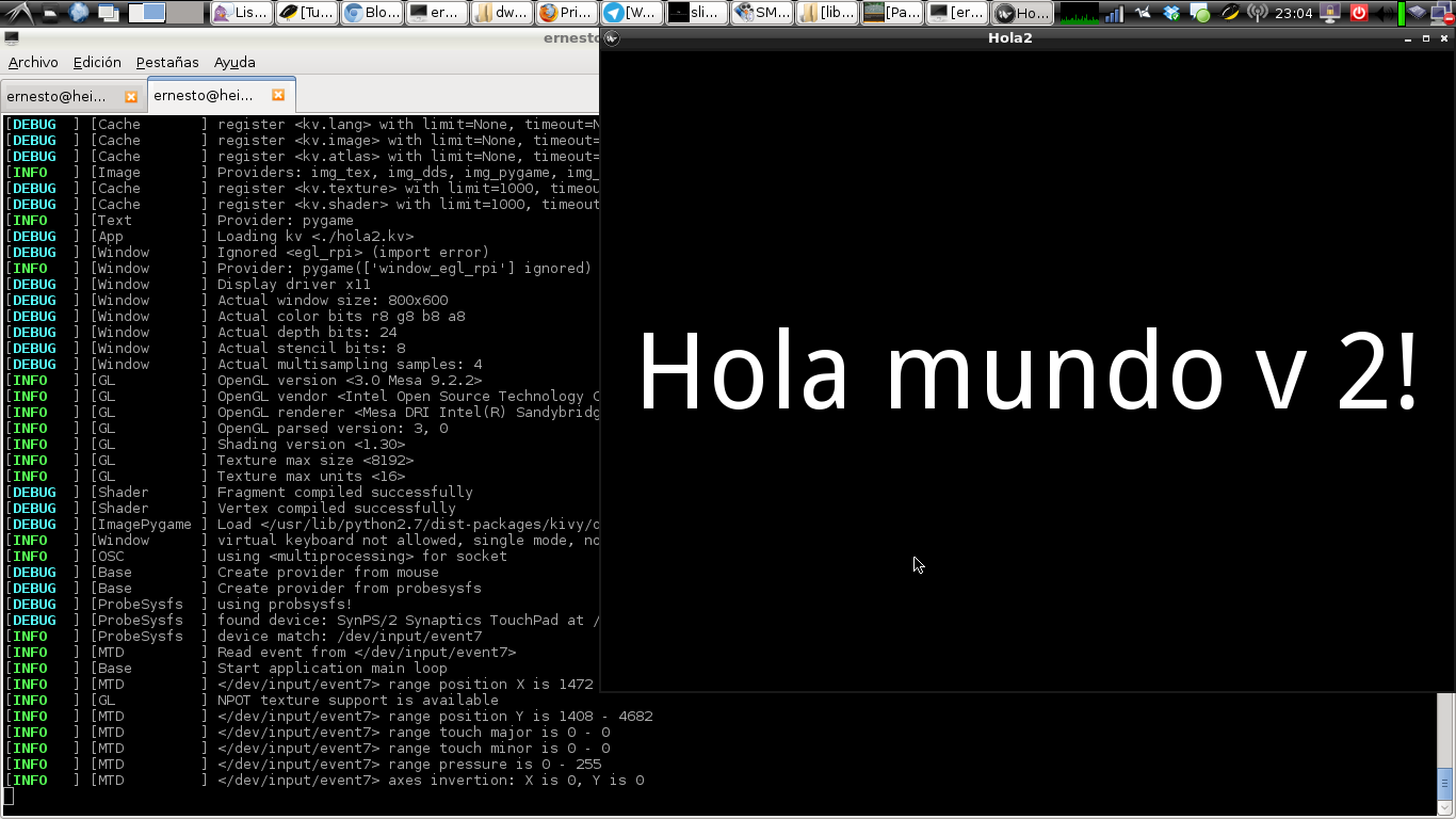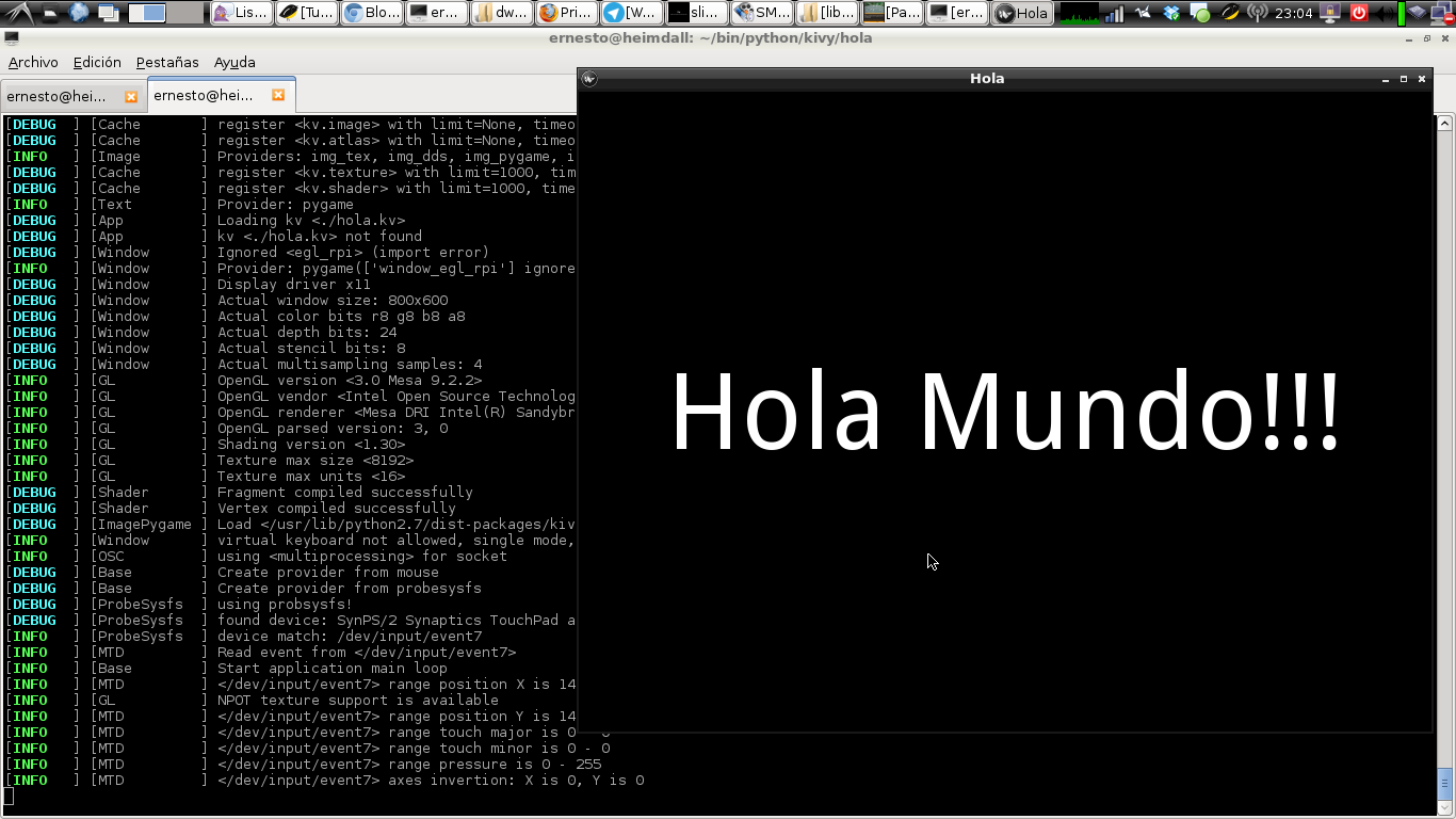 #!/usr/bin/env python #Se imposta kivy import kivy #Se valida que se use la versión 1.8.0 de kivy kivy.require('1.8.0') #Se importa la case App y el widget Label from kivy.app import App from kivy.uix.label import Label #Se crea la Clase Hola2App que hereda de App class Hola2App(App): #Se define la función build que retorna el widget Label #Esta vez sin ningún argumento ya que será manejado por el archivo hola2.kv def build(self): return Label() if __name__ == "__main__": #Se instancia la clase Hola2App y se ejecuta. Hola2App().run() Código del archivo hola2.kv: # File name: hola2.kv #:kivy 1.8.0 <Label>: text: 'Hola mundo v 2!' font_size:100