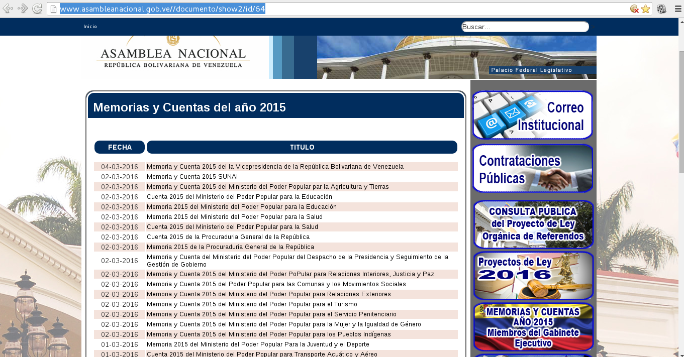 Se tiene la página de la Asamblea Nacional, donde se alojan las memorias y cuentas del Ejecutivo Nacional, pueden visitar el sitio en el siguiente enlace (enlace roto).