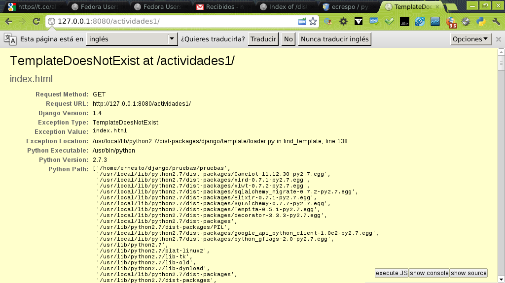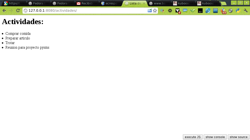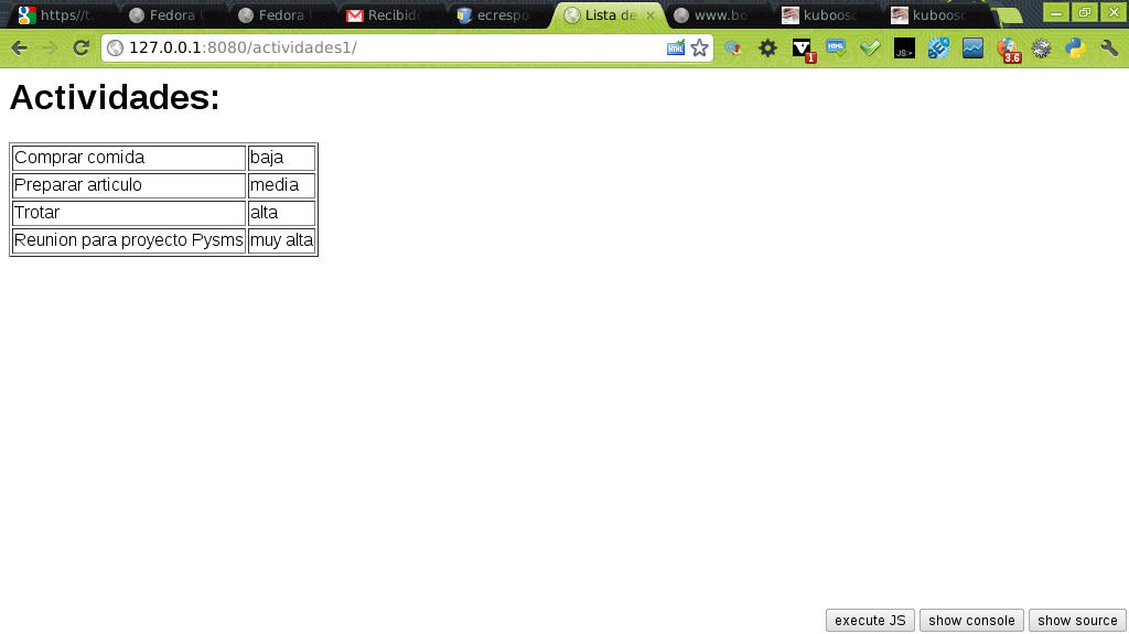 Al salvar el archivo se inicia el servidor de django (python manage.py runserver 8080) y aparece lo siguiente al navegar a http://localhost:8080/actividades1/ :