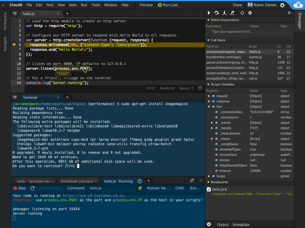Como cloud9 es OpenSource a parte de usarlo desde su sitio web, se puede montar un servidor, su código fuente se encuentra en github. El procedimiento de instalación lo encuentrán en el siguiente enlace.