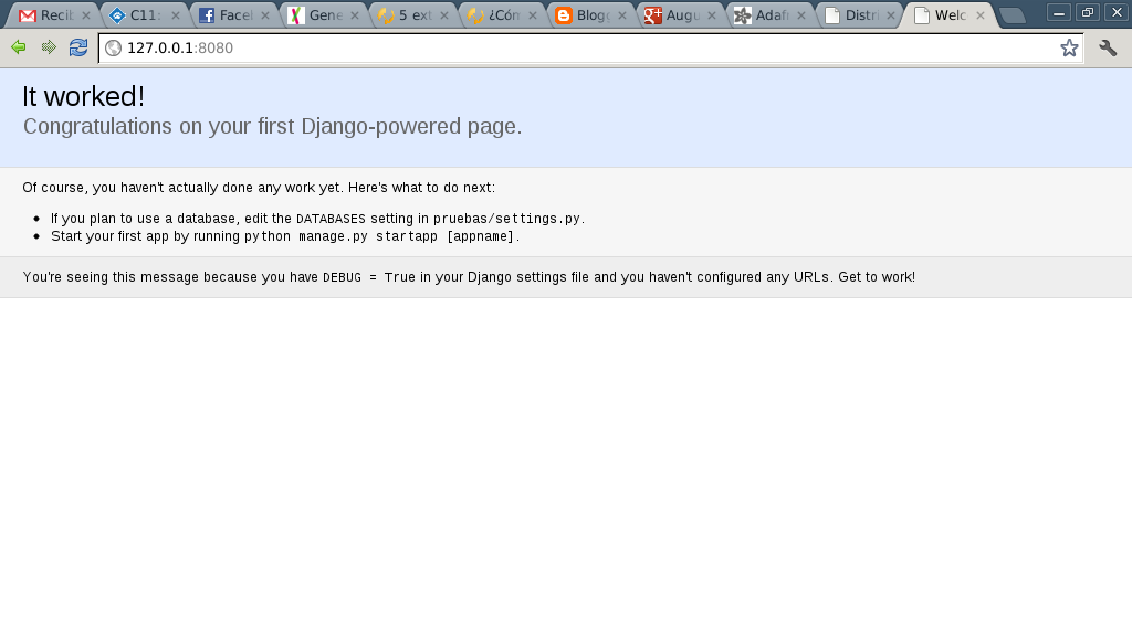 La siguiente figura muestra la página de inicio del servidor django en el navegador: