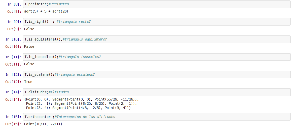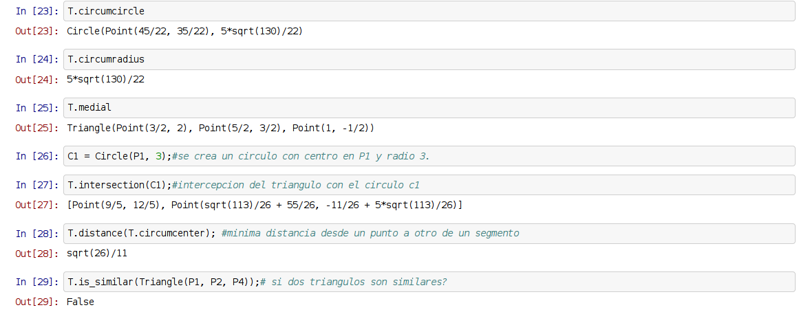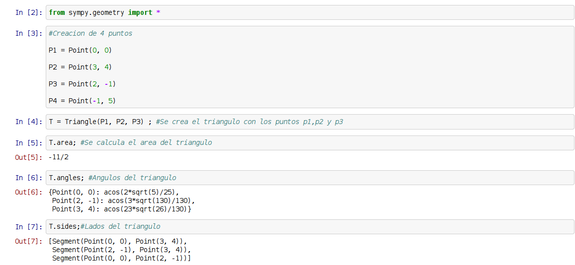 #!/usr/bin/env python from sympy.geometry import * #Creacion de 4 puntos P1 = Point(0, 0) P2 = Point(3, 4) P3 = Point(2, -1) P4 = Point(-1, 5) T = Triangle(P1, P2, P3) ; #Se crea el triangulo con los puntos p1,p2 y p3 print (T.area); #Se calcula el area del triangulo print (T.angles); #Angulos del triangulo print (T.sides);#Lados del triangulo print (T.perimeter);#Perimetro print (T.is_right()) ; #triangulo recto? print (T.is_equilateral());#triangulo equilatero? print (T.is_isosceles());#triangulo isosceles? print (T.is_scalene());#triangulo escaleno? print (T.altitudes);#Altitudes print (T.orthocenter) ;#Intercepcion de las altitudes print (T.bisectors()) ;#bisector print (T.incenter) ;#en centro print (T.incircle); #en circulo print (T.inradius); #en radio print (T.medians); #medianas print (T.centroid);#intercepcion de las medianas print (T.circumcenter); #intercepcion de bisectores perpendiculares print (T.circumcircle) print (T.circumradius) print (T.medial) C1 = Circle(P1, 3);#se crea un circulo con centro en P1 y radio 3. print (T.intersection(C1));#intercepcion del triangulo con el circulo c1 print (T.distance(T.circumcenter)); #minima distancia desde un punto a otro de un segmento print (T.is_similar(Triangle(P1, P2, P4)));# si dos triangulos son similares?