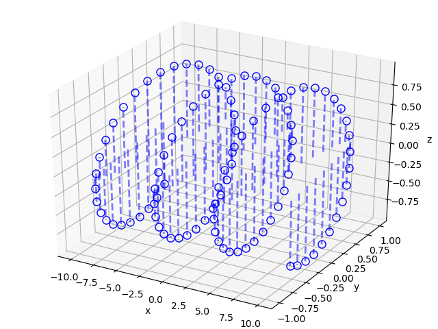 #!/usr/bin/env python3 # # Se importan las librerías necesarias from numpy import linspace, sin, cos from pylab import figure, show from mpl_toolkits.mplot3d import Axes3D # # generando algunos datos x = linspace(-10,10,100); y = sin(x); z = cos(x); # # Se crea la instancia de la figura y se asocia a la figura 3D fig = figure() ax = Axes3D(fig) # # graficando los datos for i in range(len(x)): ax.plot([x[i], x[i]], [y[i], y[i]], [0, z[i]], '--', linewidth=2, color='b', alpha=.5) # # graficando un circulo en el tope de cada curva # plotting a circle on the top of each stem ax.plot(x, y, z, 'o', markersize=8, markerfacecolor='none', color='b',label='ib') ax.set_xlabel('x') ax.set_ylabel('y') ax.set_zlabel('z') show()