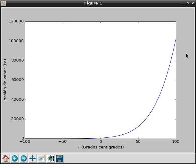 #!/usr/bin/env python3 # -*- coding: utf-8 -*- #Se importa numpy como np import numpy as np #Se importa xlabel, ylabel, plot y show de pylab from pylab import xlabel,ylabel, plot, show #Se define el rango de la temperatura, de -100 a 100 con #incrementos de 50. T = np.linspace(-100,100,50) #Se realiza el cálculo de la presión pasandole el arreglo de valores de #la temperatura es = 611*np.exp(17.27*T/(237.3+T)) #Se crea la gráfica plot(T,es) #Se define las etiquetas de los ejes X y Y. xlabel('T (Grados centigrados)') ylabel(u'Presión de vapor (Pa)') #Se muestra la gráfica show()
