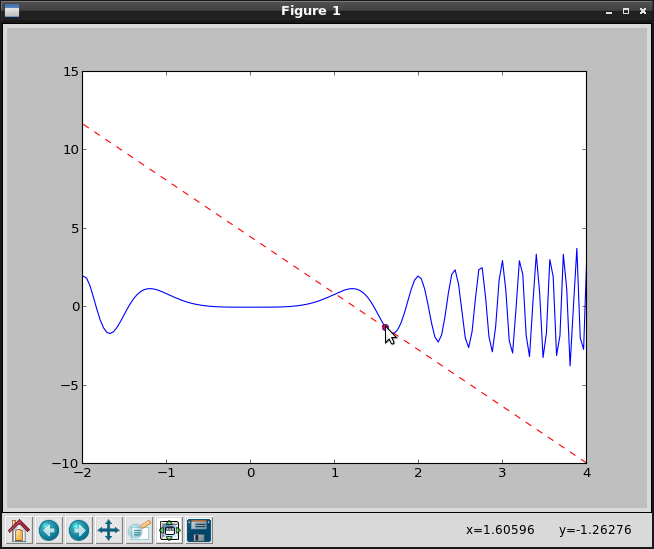 #!/usr/bin/env python #De numpy se importa sin, linspace y power from numpy import sin,linspace,power #De pylab se importa plot y show from pylab import plot,show #Se define la funcion de la curva def f(x): # sample function return x*sin(power(x,3)) # Se evalua la funcion en el rango de -2 a 4 con 150 intervalos x = linspace(-2,4,150) #Se le pasa a la funcion los valores definidos en x. y = f(x) #Se le pasa el punto a calcular la tangente de la curva. a = 1.6 #Se le pasa el diferencial con un valor de 0.1 h = 0.1 #Se calcula la derivada. fprime = (f(a+h)-f(a))/h # derivative #Se calcula la tangente tan = f(a)+fprime*(x-a) # tangent # Se grafica la funcion y la tangente. plot(x,y,'b',a,f(a),'om',x,tan,'--r') #Se muestra la grafica. show()