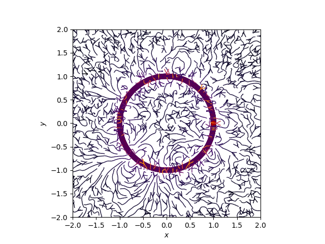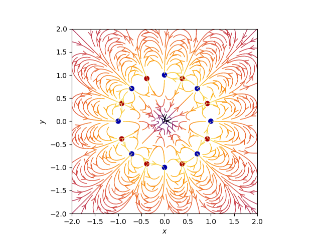 Matplotlib provee una función llamada streamplot, para crear flujos que puede usarse para representar vectores de campo. El código python muestra la representación de un campo eléctrico a partir de multiples cargas. Las multiples cargas son seleccionadas como potencia de 2 (1 dipolo, 2 cuadrupolo, etc).