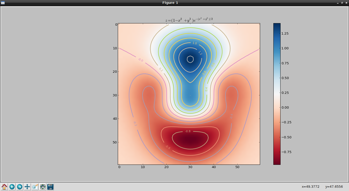 #!/usr/bin/env python #De numpy se explorta arange y exp from numpy import exp,arange #De pylab se importa meshgrid, cm, imshow, contour, clabel, clorbar, axis, title y show from pylab import meshgrid,cm,imshow,contour,clabel,colorbar,axis,title,show from mpl_toolkits.mplot3d import Axes3D from matplotlib import cm from matplotlib.ticker import LinearLocator, FormatStrFormatter import matplotlib.pyplot as plt #Se define la funcion que se va a graficar def z_func(x,y): return (1-(x**2+y**3))*exp(-(x**2+y**2)/2) def graficaIntencidad(Z): #Se dibuja la funcion im = imshow(Z,cmap=cm.RdBu) #Se agrega el contorno de lineas con sus etiquetas cset = contour(Z,arange(-1,1.5,0.2),linewidths=2,cmap=cm.Set2) clabel(cset,inline=True,fmt='%1.1f',fontsize=10) #Se agrega la barra de colores a la derecha colorbar(im) #Se crea el titulo de la grafica con estilo latex title('$z=(1-x^2+y^3) e^{-(x^2+y^3)/2}$') #Se muestra la grafica show() def grafica3D(X,Y,Z): fig = plt.figure() ax = fig.gca(projection='3d') surf = ax.plot_surface(X, Y, Z, rstride=1, cstride=1, cmap=cm.RdBu,linewidth=0, antialiased=False) ax.zaxis.set_major_locator(LinearLocator(10)) ax.zaxis.set_major_formatter(FormatStrFormatter('%.02f')) fig.colorbar(surf, shrink=0.5, aspect=5) plt.show() if __name__ == '__main__': #rango de valores para x y y. x = arange(-3.0,3.0,0.1) y = arange(-3.0,3.0,0.1) #Se define la grilla de puntos X,Y = meshgrid(x, y) #Se evalua la funcion segun los valores de X y Y Z = z_func(X, Y) graficaIntencidad(Z) grafica3D(X,Y,Z)