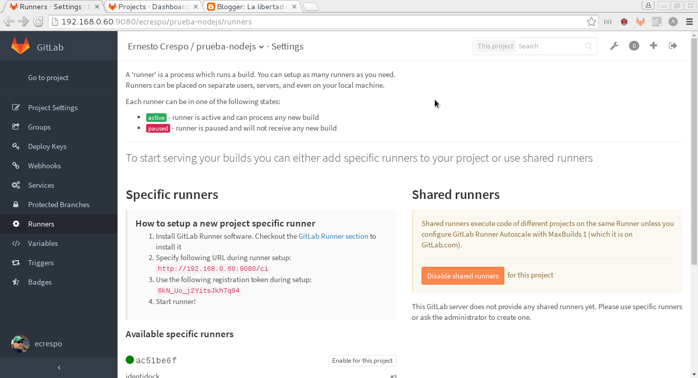 Lo que viene a continuación es registrar un proyecto que se encuentre en gitlab. En este caso se va a crear un proyecto en gitlab-ce y se va a la configuración del mismo, ahí se selecciona la parte de runners: