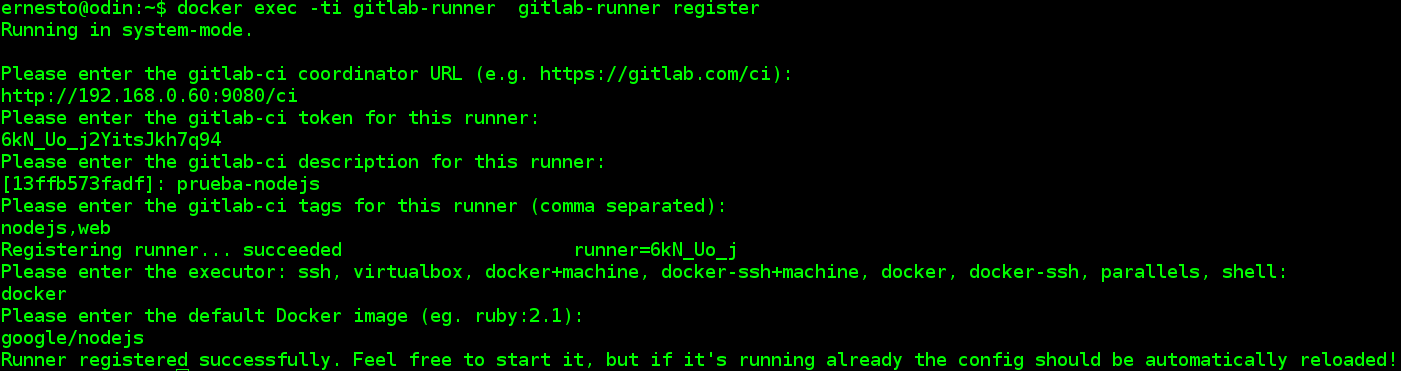 Se le pasó el url, el token, luego pregunta la descripción del proyecto en este caso prueba-nodejs, luego unas etiquetas del mismo, se va a usar docker y por último la imagen base de Docker que se va a usar.