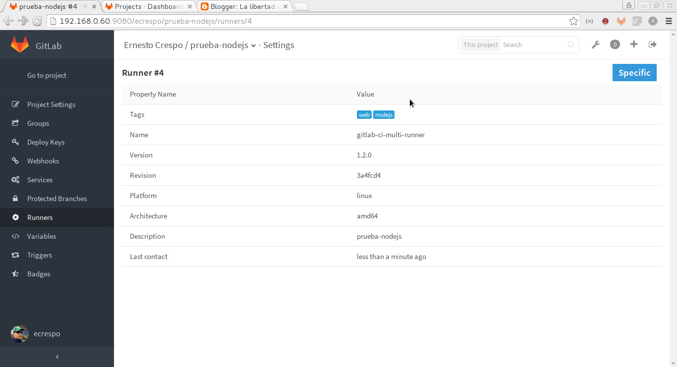 Para terminar se muestra una imagen de la configuración del runner que indica que el runner y gitlab se encuentran conectados: