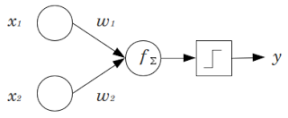 En la siguiente figura se muestra una red neuronal de dos entradas, cada entrada tiene su peso, luego se suman y la función de activación genera una salida.