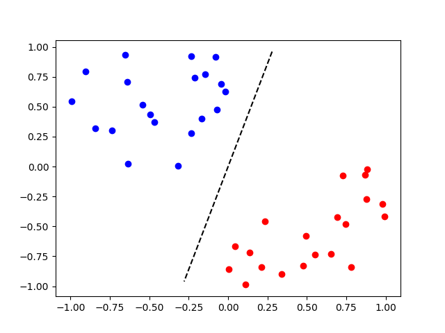 Los puntos azules pertenecen a la primera clase y los rojos pertenecen a la segunda. La línea punteada es la línea de separación que el perceptrón aprendió durante el entrenamiento.