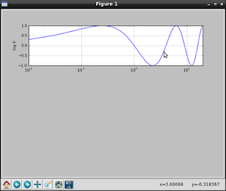 #!/usr/bin/env python #Importar matplotlib import matplotlib as mpl #Definir el tamaño de la fuente mpl.rcParams['font.size'] = 10. #Importar pyplot import matplotlib.pyplot as plt #Importar numpy import numpy as np #Se crea el rango de valores de # 0 a 20 con saltos de 0.01 x = np.arange(0., 20, 0.01) #Se instancia la figura fig = plt.figure() #Se define la grafica ax2 = fig.add_subplot(311) #Se genera el calculo de la funcion #con numpy y2 = np.sin(np.pi*(x**(1.0/2.0))) #Se define el eje X con escala #logaritmica ax2.semilogx(x, y2); #Se define el limite del eje X ax2.set_xlim([0, 20]); #Se define la grilla a la grafica ax2.grid(True) #se define una etiqueta en el eje Y ax2.set_ylabel('log X') #Se muestra la grafica plt.show()