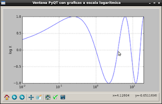 #!/usr/bin/env python #Importar numpy import numpy as np # Importar el objeto Figure de matplotlib from matplotlib.figure import Figure #Importar el Objeto FigureCanvas de Qt4Qgg, #Se heredara desde QWidget. from matplotlib.backends.backend_qt4agg \ import FigureCanvasQTAgg as FigureCanvas #Importar el widget de la barra de navegacion # import the NavigationToolbar Qt4Agg widget from matplotlib.backends.backend_qt4agg \ import NavigationToolbar2QTAgg as NavigationToolbar #Importar QTGui de PyQt4. from PyQt4 import QtGui #Se crea la Clase Qt4MplCanvas heredando FigureCanvas class Lienzo(FigureCanvas): def __init__(self, parent): # Se instancia el objeto figure self.fig = Figure() #Se define la grafica en coordenadas polares self.axes = self.fig.add_subplot(111) #Se define el rango de 0 a 20 con saltos de 0.01 x = np.arange(0., 20, 0.01) #Se calcula los valores de la funcion. y2 = np.sin(np.pi*(x**(1.0/2.0))) #Se define el eje X como logaritmico #y se pasan los valores de x y y2. self.axes.semilogx(x, y2); #Se define el limite del eje X self.axes.set_xlim([0, 20]); #Se define una grilla self.axes.grid(True) #Se crea una etiqueta en el eje Y self.axes.set_ylabel('log X') # se inicializa FigureCanvas FigureCanvas.__init__(self, self.fig) # se define el widget padre self.setParent(parent) # se define el widget como expandible FigureCanvas.setSizePolicy(self, QtGui.QSizePolicy.Expanding, QtGui.QSizePolicy.Expanding) # se notifica al sistema de la actualizacion #de la politica FigureCanvas.updateGeometry(self) #Se crea la clase Ventana que hereda QMainWindow class Ventana(QtGui.QMainWindow): def __init__(self): #Inicializacion del widget QMainWindow QtGui.QMainWindow.__init__(self) # se define el titulo de la ventana self.setWindowTitle("Ventana PyQT con graficas a escala logaritmica") # instantiate a widget, it will be the main one # Se instancia el widget. self.main_widget = QtGui.QWidget(self) #Se crea una layout vbox vbl = QtGui.QVBoxLayout(self.main_widget) #Se instancia el Lienzo con la grafica de Matplotlib qmc = Lienzo(self.main_widget) # se instancia la barra de navegacion ntb = NavigationToolbar(qmc, self.main_widget) # se empaqueta el lienzo y #la barra de navegacion en el vbox vbl.addWidget(qmc) vbl.addWidget(ntb) # se le asigna foco a la ventana self.main_widget.setFocus() #Se define el widget central self.setCentralWidget(self.main_widget) if __name__ == '__main__': #Importar sys import sys #Importar QtGui de PyQt4 from PyQt4 import QtGui #Se crea la aplicacion grafica qApp = QtGui.QApplication(sys.argv) # se instancia la ventana aw = Ventana() # se muestra el widget aw.show() #Se inicia el lazo principal de QT sys.exit(qApp.exec_())
