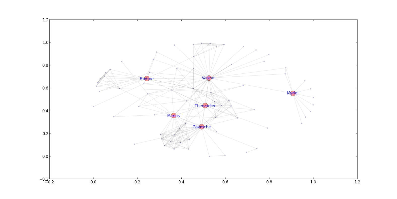 Se usará la librería networkx para tomar la información del archivo lesmiserables.gml (enlace roto) , para obtener los nodos más influyentes se usará la centralidad por intermediación.