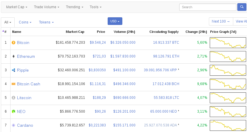 Coinmarketcap es un sitio que muestra la capitalización de las distintas criptomonedas existentes en tiempo real, a continuación se muestra una captura de pantalla del sitio: