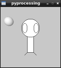 #!/usr/bin/env python # -*- coding: utf-8 -*- #Se importa pyprocessing from pyprocessing import * #define el tamaño de la ventana. size(200,200) #Define un rectangulo en el centro de la ventana rectMode(CENTER) #Se crea el rectangulo(x,y,ancho,alto) rect(100,100,20,100) #Se crean 3 elipses(x,y,ancho,alto) ellipse(100,70,60,60) ellipse(81,70,16,32) ellipse(119,70,16,32) #Se crean 2 lineas(x1,y1,x2,y2) line(90,150,80,160) line(110,150,120,160) #No se crea bordes en la figura noStroke(); #Define que tendrá luz la esfera lights(); #Define la cantidad de desplazamiento con respecto a la ventana. #(derecha/izquierda,arriba/abajo,delante/detrás) translate(28, 48, 0); #Se crea una esfera con radio 15 sphere(15) #Se muestra en la ventana. run()