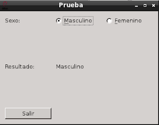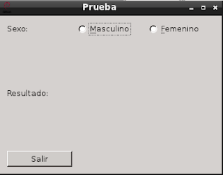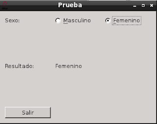 La idea es que el usuario seleccione uno de las opciones presentadas en este caso se le pregunta el sexo; al darle clip con el ratón o presionar alt+f para femenino o alt+m para masculino el resultado se muestre en una etiqueta automáticamente. Se tiene un botón para salir del programa.