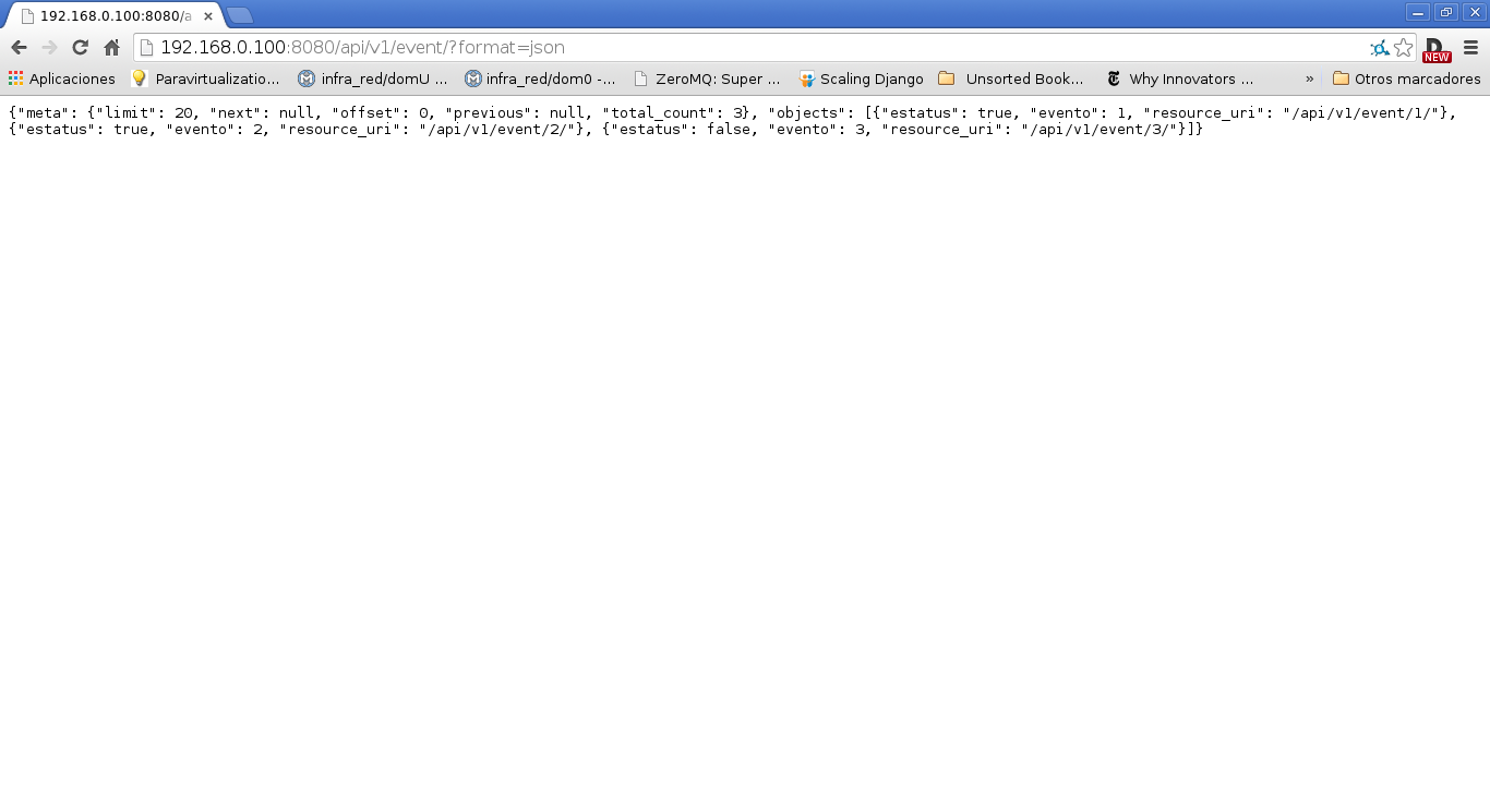 La siguiente figura muestra la consulta de los eventos http://192.168.0.100:8080/api/v1/event/?format=json: