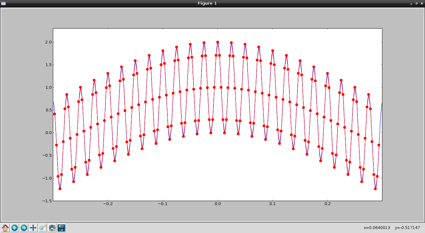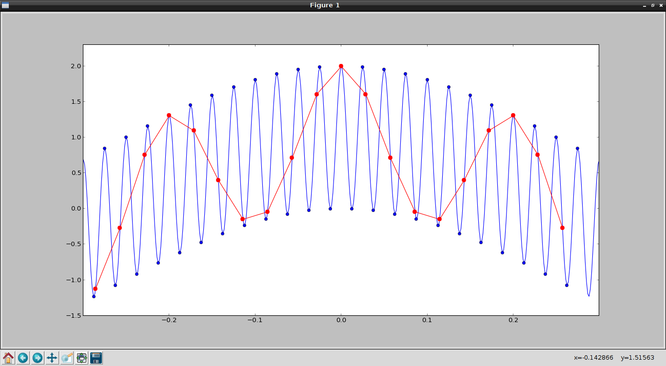 Con puntos azules se tiene el muestreo a 80Hz, con puntos rojos se tiene el muestreo a 35 Hz, se nota que el muestreo a 80 Hz es suficiente para capturar la oscilación de la señal.
