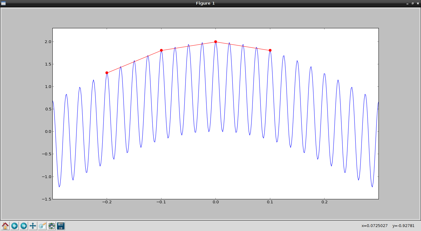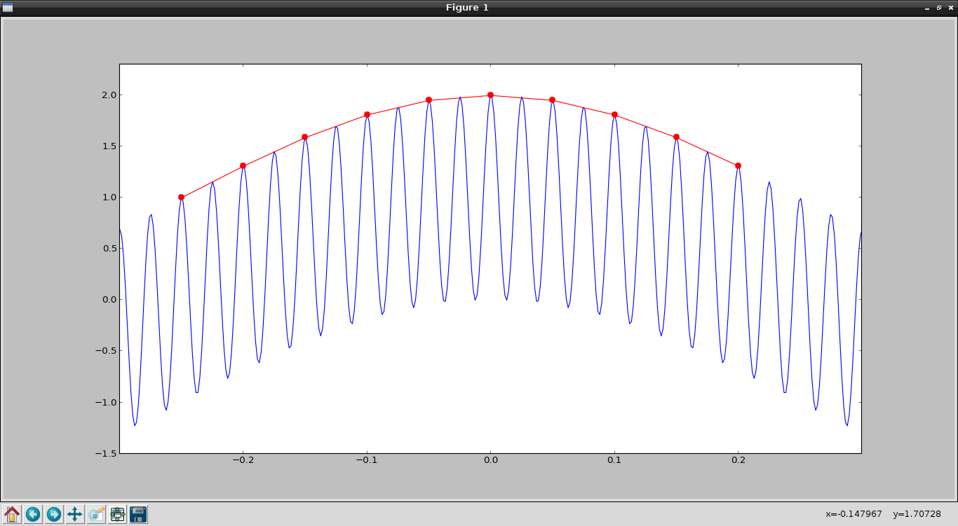 #!/usr/bin/env python #De numpy se importa lo necesario para graficar la #funcion seno from numpy import linspace,sin,cos,pi,ceil,floor,arange #De pylab se importa plot, show y axis. Lo necesario para crear #la grafica from pylab import plot,show,axis #Muestreo de una seganl de ancho de banda 40 hz # con velocidad de muestreo de 80 Hz f = 40; # Hz #Tiempo minimo y maximo tmin = -0.3; tmax = 0.3; #Se define el tiempo de la segnal. t = linspace(tmin, tmax, 400); #Se define la segnal de muestreo x = cos(2*pi*t) + cos(2*pi*f*t) #Se grafica el tiempo y la segnal. plot(t, x) # sampling the signal with a sampling rate of 80 Hz # in this case, we are using the Nyquist rate. #Muestreo de la segnal con una velocidad de muestreo de 80 Hz. #Periodo de muestreo T = 1/80.0; #Tiempo minimo nmin = ceil(tmin / T); #Tiempo maximo nmax = floor(tmax / T); #Tiempo de la segnal. n = arange(nmin,nmax); #Segnal a la velocidad de muestreo x1 = cos(2*pi*n*T) + cos(2*pi*f*n*T); #Se grafica la segnal. plot(n*T, x1, 'bo') #Muestreo de la segnal con una velocidad de muestreo de 35Hz. #Note que 35Hz esta por debajo de la velocidad de Nyquist. T = 1/35.0; nmin = ceil(tmin / T); nmax = floor(tmax / T); n = arange(nmin,nmax); x2 = cos(2*pi*n*T) + cos(2*pi*f*n*T); plot(n*T, x2, '-r.',markersize=15) axis([-0.3, 0.3, -1.5, 2.3]) show()