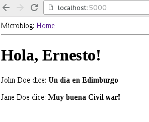 {% extends "base.html" %} {% block content %} <h1>Hola, {{ usuario.nickname }}!</h1> {% for post in posts %} <p> {{ post.autor.nickname }} dice: <b>{{ post.cuerpo }}</b> </p> {% endfor %} {% endblock %}