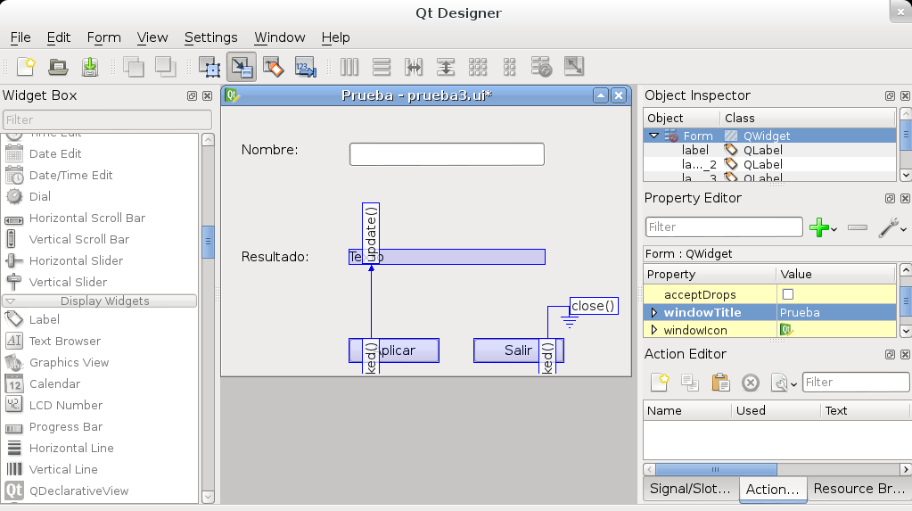 Se resalta en color azul la relación de ambos botones (Salir y Aplicar) con los eventos (Form.close y label_3.update).