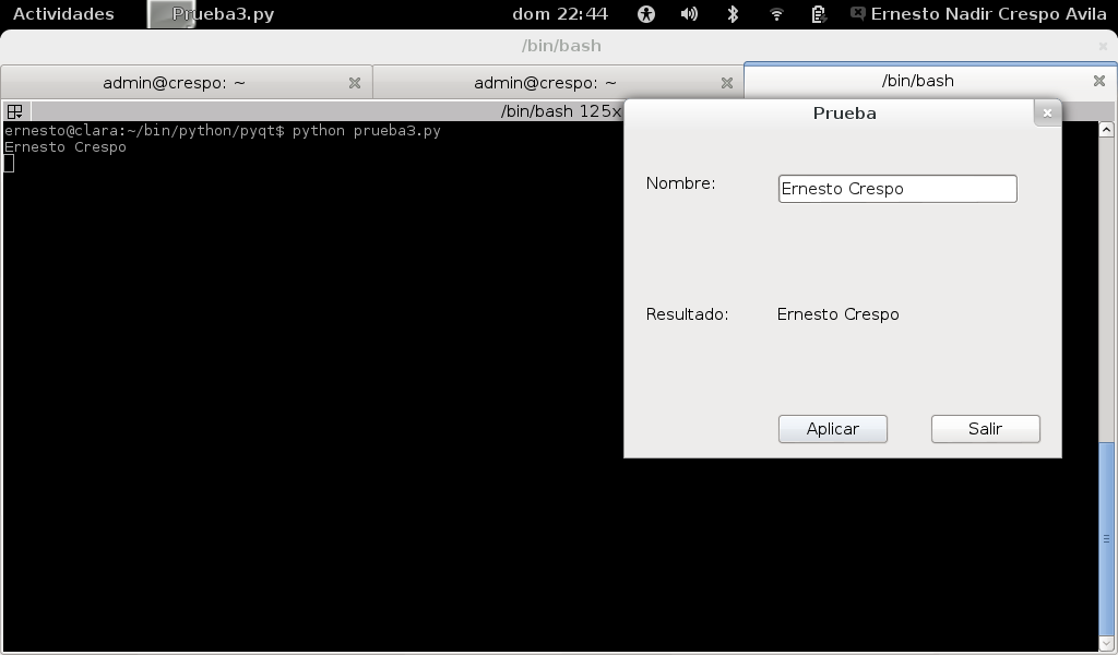 Se pedirá el nombre de la persona y al darle click al botón Aplicar se mostrará el nombre colocado en la entrada de datos en la etiqueta, se tiene un segundo botón el cual termina la ejecución de la aplicación al darle click.