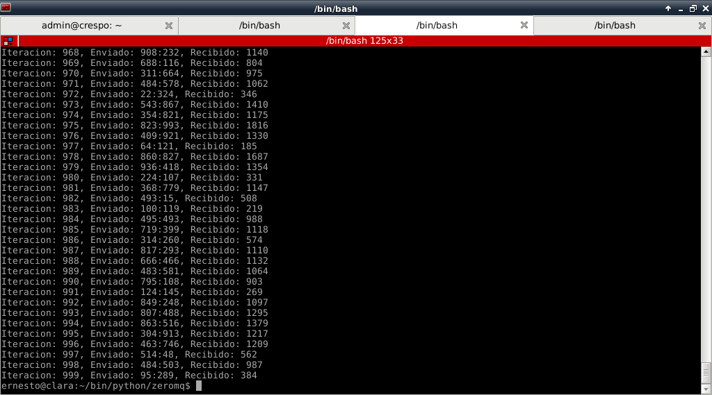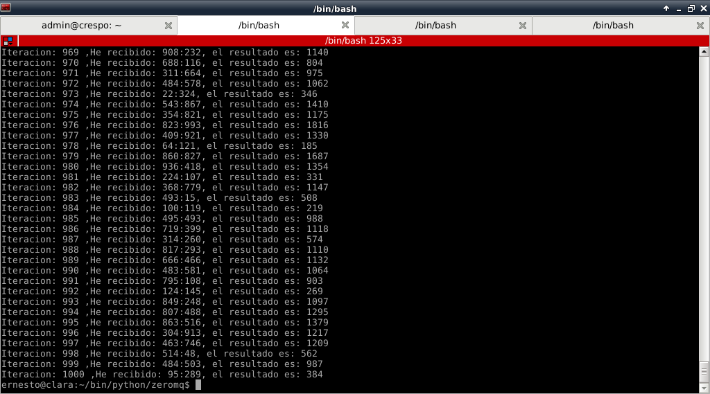 En este artículo se explicará un uso sencillo de zeroMQ al estilo cliente y servidor. Se usará el puerto 5000 para la comunicación entre el cliente y servidor. En el cliente se genera de forma aleatoria 2 números que se le pasan al servidor que sacará una cuenta y devuelve el resultado al cliente quien muestra el resultado en pantalla. La generación de números se realiza 1000 veces, luego le pasa al servidor la letra q la cual es la señal para terminar el servidor.