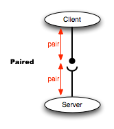 La figura representa la estructura de sockets pares, el servidor escucha en un puerto seguro y un cliente se conecta a el. Las líneas rojas muestran el flujo de los mensajes, en este patrón ambos extremos usan el patrón par, y los mensajes fluyen de manera bidireccional.