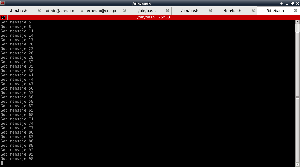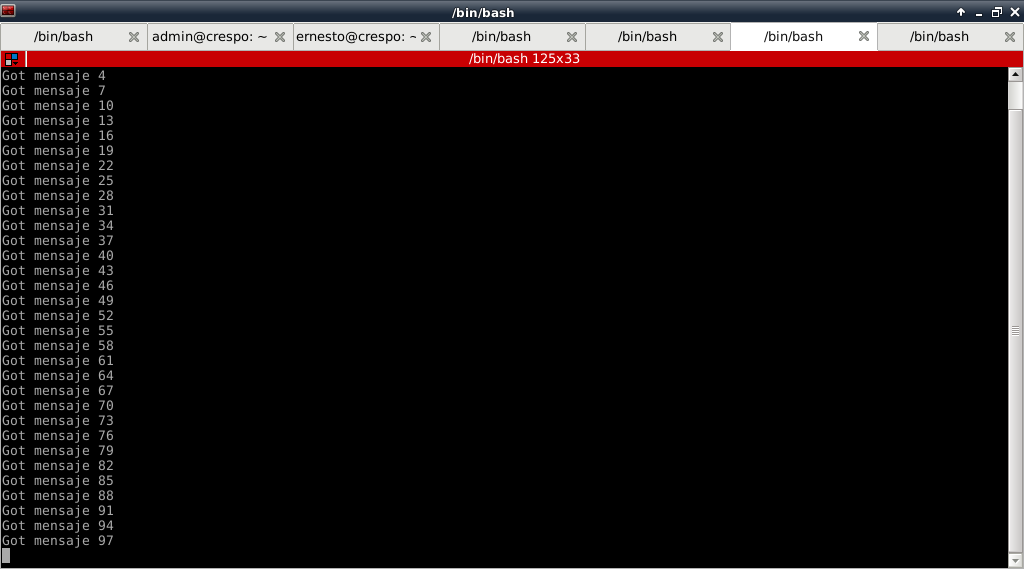 #!/usr/bin/env python #importar zeromq import zmq #Se crea una instancia del contexto context = zmq.Context() #Se crea el socket con parametro peticion (REQ) socket = context.socket(zmq.REQ) #Se crean 3 sockets con la IP y los 3 puertos donde escucha #los 3 servidores. socket.connect("tcp://127.0.0.1:5000") socket.connect("tcp://127.0.0.1:6000") socket.connect("tcp://127.0.0.1:7000") #Se crea un ciclo de 100 repeticiones for i in range(100): #Se crea el string del mensaje mensaje = "mensaje %s" % i #Se envia el mensaje socket.send(mensaje) #Se muestra en pantalla el mensaje enviado print "Enviando", mensaje #Se recibe el mensaje de vuelta msg_in = socket.recv()