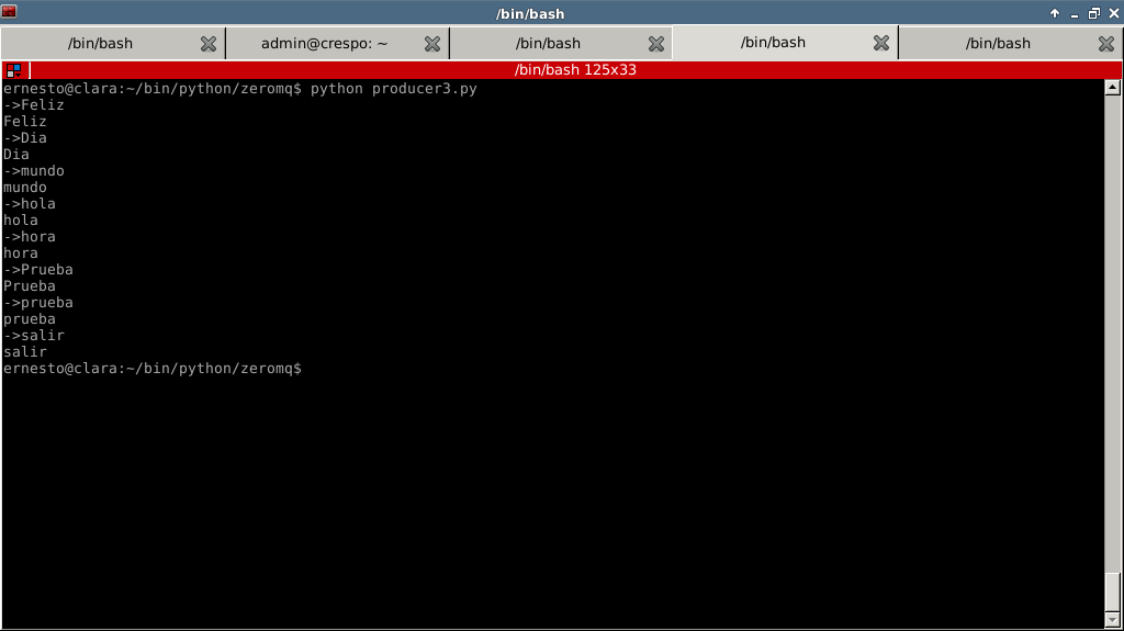 El ejemplo que se mostrará se basa en el artículo de Saghul Ibarra en su blog Saghul Ibarra en su blog. El productor crea una línea de comandos donde se pasa el texto al consumidor, el consumidor recibe el texto y sólo se muestra en pantalla el texto que está definido en la subscripción.