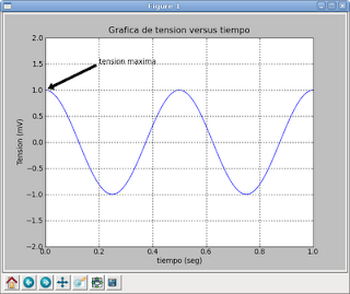 >>> import numpy >>> import pylab >>> t = numpy.arange(0.0, 1.0+0.01, 0.01) >>> s = numpy.cos(2*2*numpy.pi*t) >>> pylab.plot(t, s) [] >>> pylab.xlabel('tiempo (seg)') >>> pylab.ylabel('Tension (mV)') >>> pylab.title('Grafica de tension versus tiempo') >>> pylab.axis([0,1, -2,2]) >>> pylab.grid(True) >>> pylab.annotate('tension maxima', xy=(0, 1), xytext=(0.2, 1.5),arrowprops=dict(facecolor='black', shrink=0.05),) >>> pylab.savefig('grafica.png') >>> pylab.show()